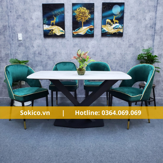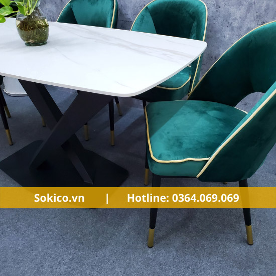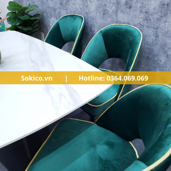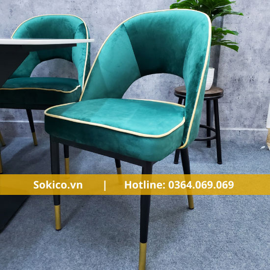 Các ghế được bọc bằng vải nhung cao cấp, mang lại cảm giác êm ái và thoải mái cho người sử dụng. Chân ghế được làm bằng kim loại sáng bóng, đem lại vẻ đẹp hiện đại, trẻ trung cho sản phẩm.